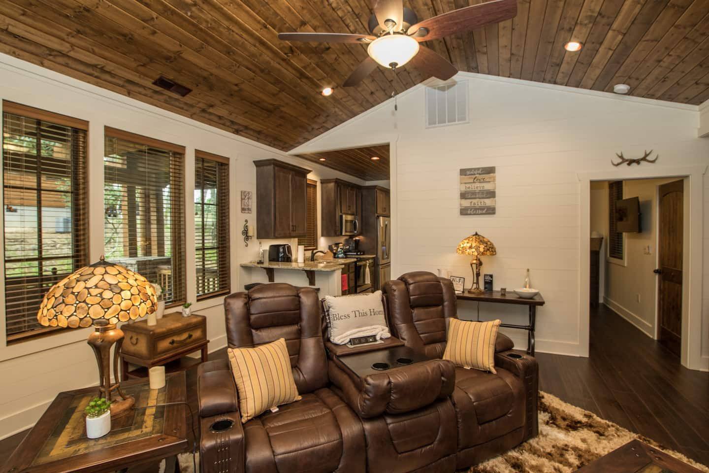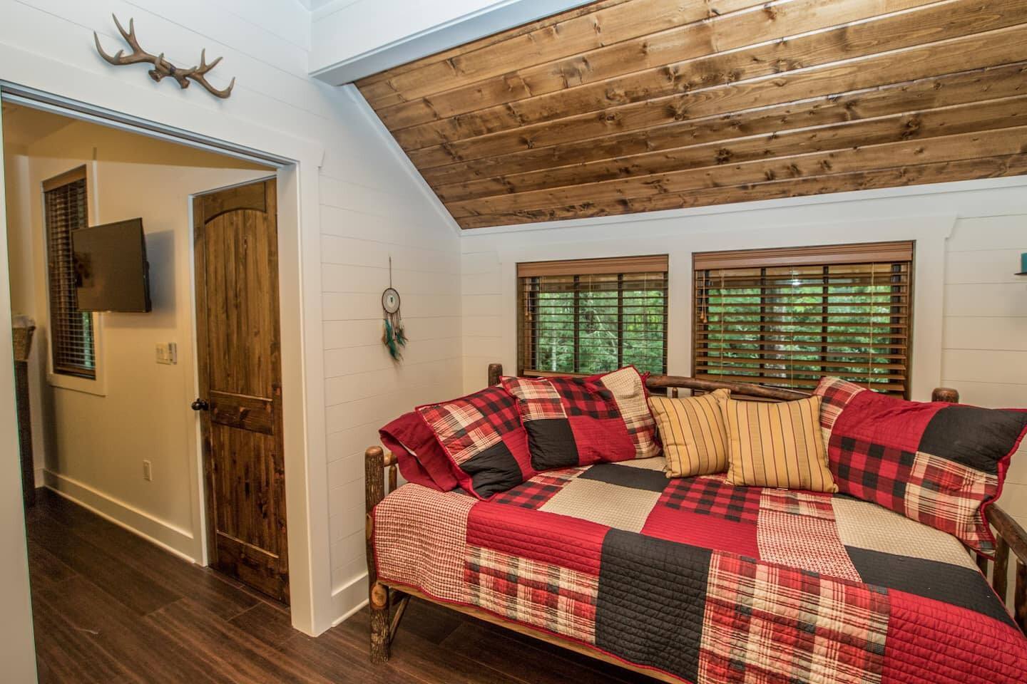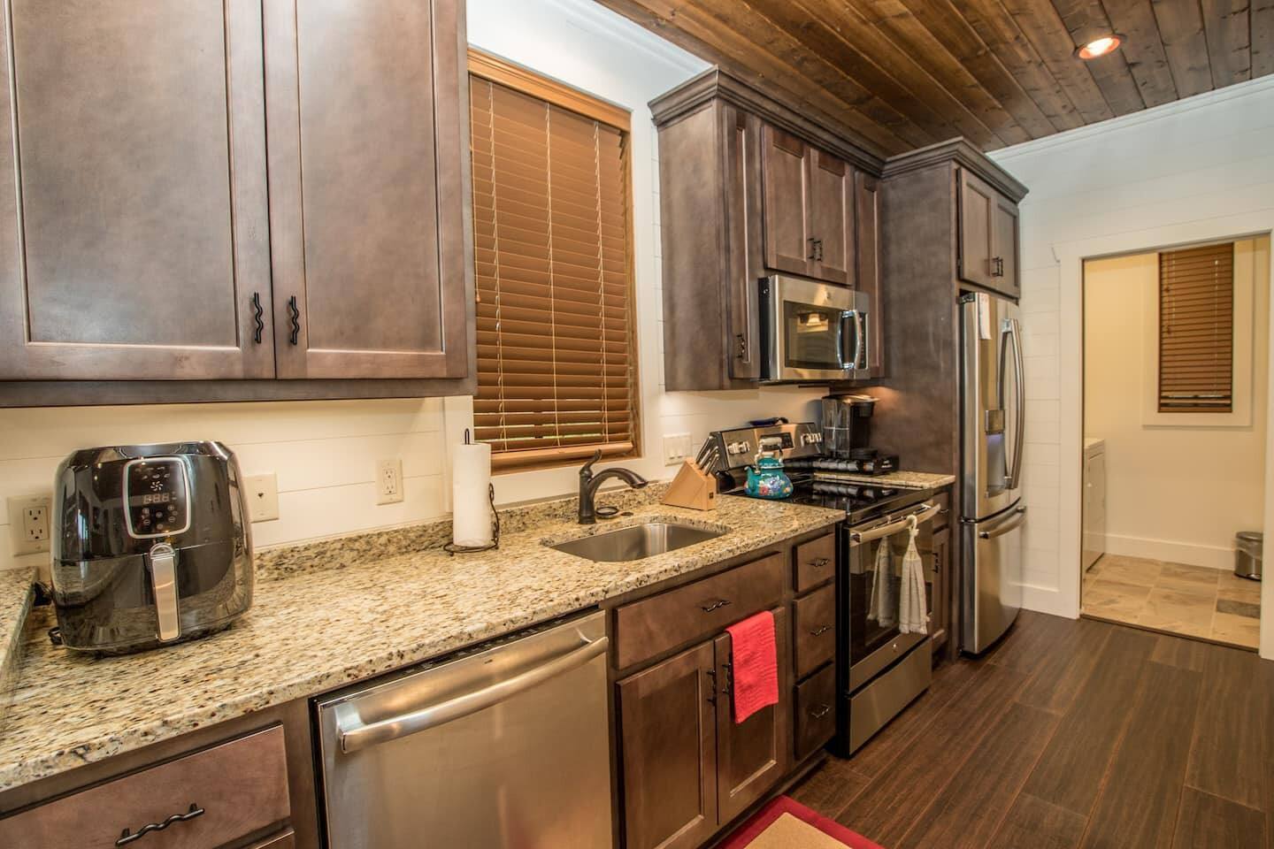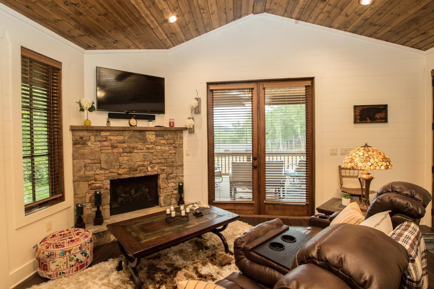 Perfect for Families | New Construction | Central A/C | Private Enclosed Deck Pet Friendly with fee You won’t have to wander far to enjoy the great outdoors while staying at this charming cottage, perfect for groups of fishing fanatics, nature lovers and golf enthusiasts or anyone seeking a break from life! If you’re craving all the peace and quiet of the woods, but don’t want to part with modern comforts and upscale amenities, this Chinquapin home is your perfect match! Master Bedroom: King Bed Living Room: Sofa Bed CHINQUAPIN AMENITIES: Dog park, basketball hoop, driving range, fire pit, hiking trails, horseback riding trails, waterfalls, disc golf fishing pond, teepee rentals, helipad COVERED PORCH: Fire Pit, patio table, Comfy Chairs INDOOR LIVING: Gas fireplace, flat-screen Smart TVs, full en-suite bathroom KITCHEN: Fully equipped, stainless steel appliances, Keurig and drip coffee maker, blender, crockpot, toaster, breakfast bar GENERAL: Free WiFi, in-unit washer/dryer, linens/towels PARKING: Driveway (2 vehicles), parking lot * NOTE: There may be some construction noise on Mondays through Fridays *
