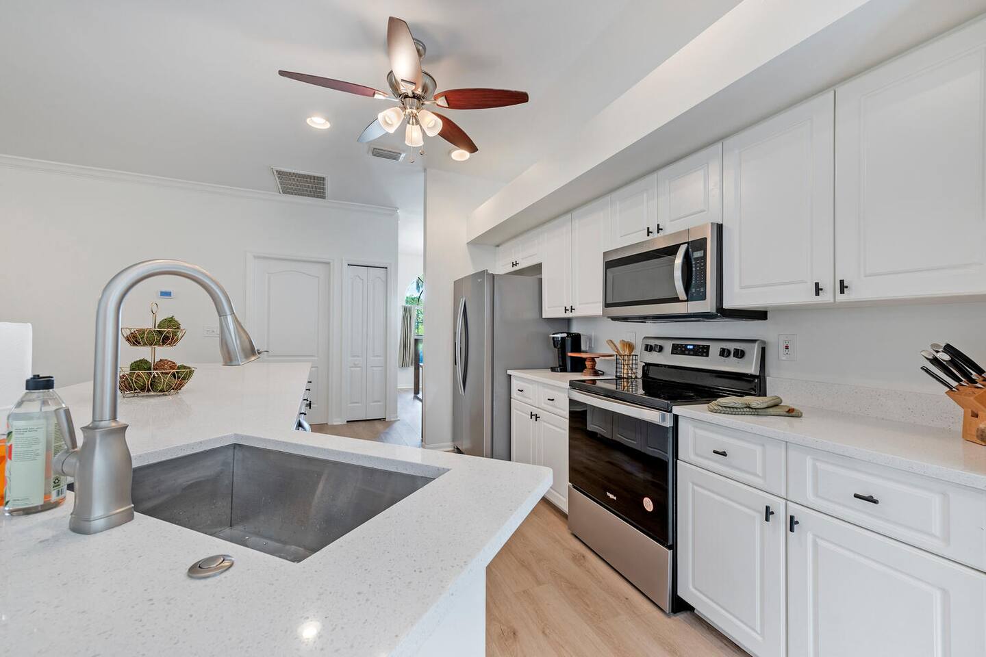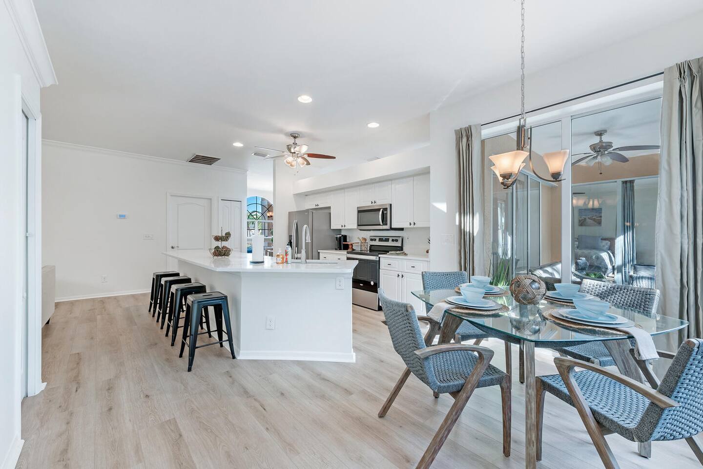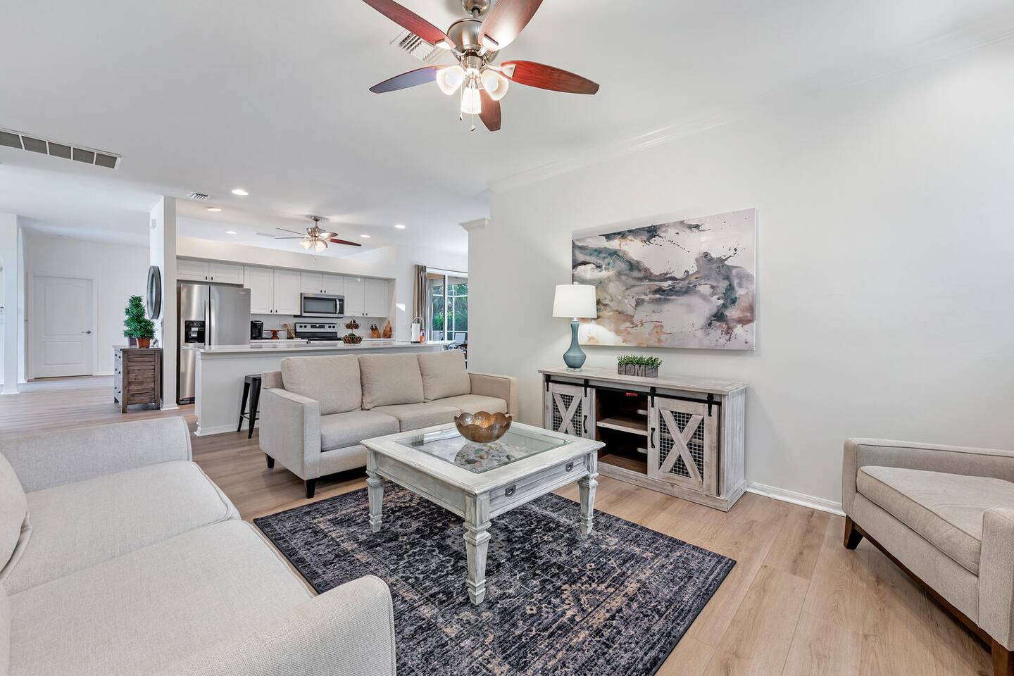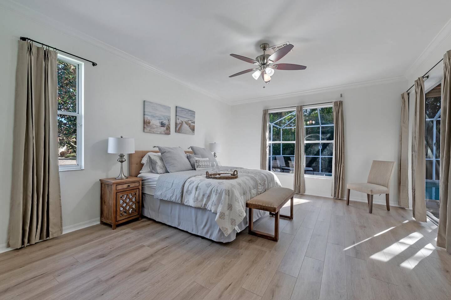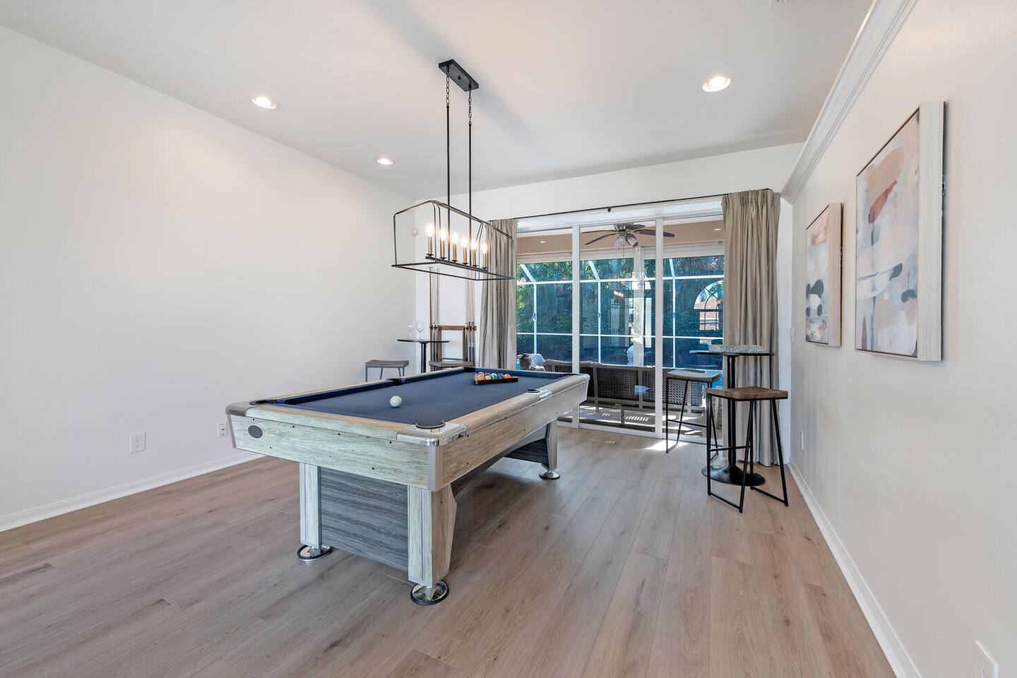 The space Private pickle ball and tennis courts. The space Get a true Florida vacation when you step inside this gorgeous, bright and airy home with high ceilings, fans and sliding glass doors to the patio area and pool deck, giving an immediate sense of Florida indoor/outdoor living at its best. A stylish design and a rich amenity list will satisfy your every need. ✔ 3 Comfy BRs (1 rooms with King bed!) ✔ Gated Community ✔ Pool Table and Game Room ✔ tropical Landscape View ✔ Open Design Living ✔ Fully Equipped Kitchen ✔ Swimming Pool ✔ Beach Accessories ✔ Smart TVs ✔ High-Speed Wi-Fi ✔ Free Parking ★ ENCLOSED POOL AREA ★ Learn more below* Surrounded by lush, tropical gardens, the outside patio and pool area is completely screened, and ready for your ‘al fresco’ dining, and poolside lounging and sunbathing. The outdoor chefs amongst you will love the gas BBQ/grill. The spacious open plan living area is comfortable and sociable, with a large smart TV including all the popular streaming apps. We also included a comfortable queen size pull out couch for any extra guests. The dining area is perfect for indoor entertaining and leads through to the fully equipped kitchen, including a breakfast bar and a coffee station that will satisfy all coffee lovers’ needs! To the left of the living area is the master suite, which also overlooks the pool and has private access from the bedroom. It has a king-sized bed, a large walk-in closet, and private deluxe bathroom. The master bathroom has a soaking tub, ‘his and hers’ sinks and a separate walk-in shower. It also has a large smart TV. On the opposite side of the living area are the second and third guest bedrooms, which share a bathroom with a shower/tub combination. Both bedrooms have queen-sized beds, and ample closet space. The laundry room is equipped with a washer and dryer and basic supplies and has access to the 2-car garage. Feel free to park the garage. There are also basic beach supplies, bikes if not broken, and various inflatables for your enjoyment. Pool heat is an additional $25/night from May 1-October 31, and $40/night Nov 1-April 30 as long as heater is working. We may consider hosting a furry member of your family (dogs only). PLEASE INQUIRE FIRST. We do have restrictions (under 35lbs) and would like to know a little about your dog before approving it. There will be a non-refundable pet fee of $199 (conditional upon approval) We can also provide a weekly cleaning service for an additional charge.