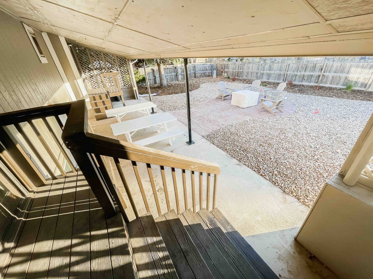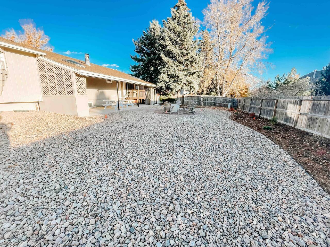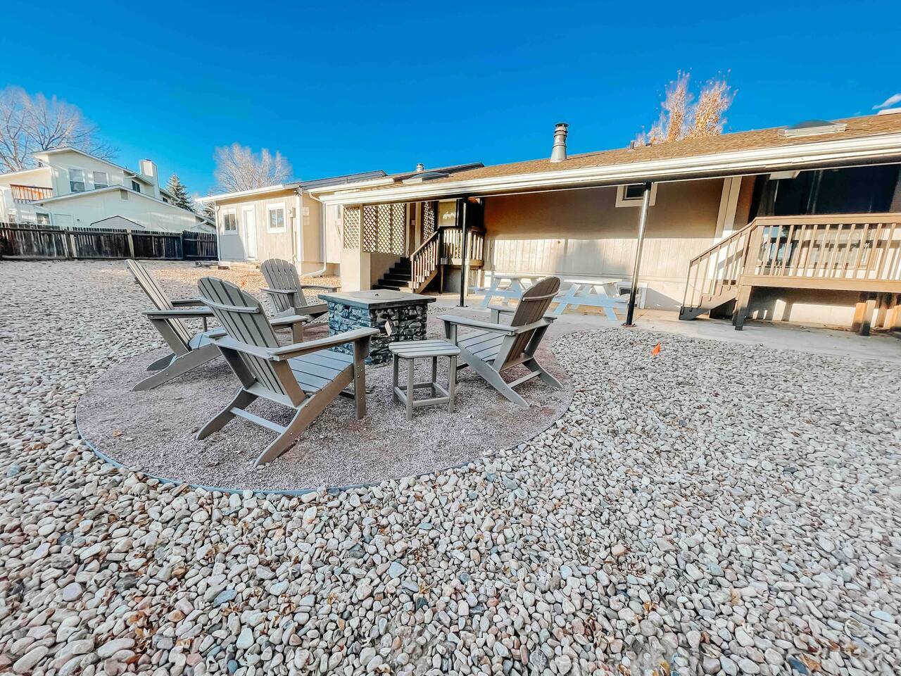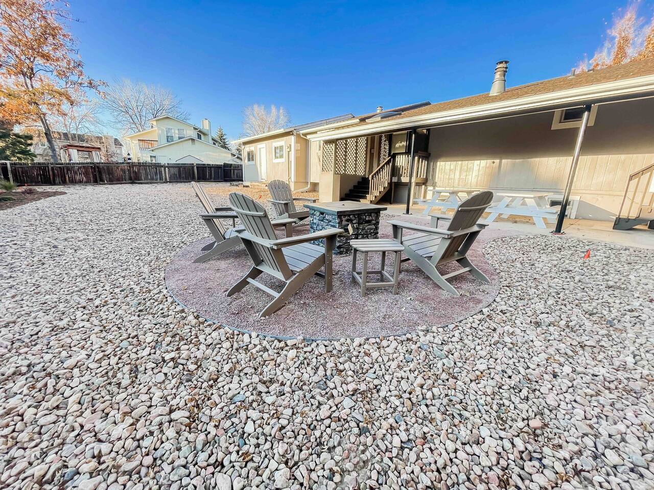 Welcome to home to this beautifully renovated 6 bedroom, 4 bath house located in North Colorado Springs. Walking through the front door you will be greeted by an open concept living, dining and kitchen. Relax on the large sectional sofa in front of one of two 70 in tvs or head straight out back to the spacious backyard; complete with a fire pit to enjoy on those chilly Colorado evenings. This home is perfect for large groups! Eat at one of two farmhouse style dining room tables, the eat in kitchen island, or one of the two outdoor picnic tables located under the backyard awning, complete with outdoor string lights to create the ambiance you're looking for on your vacation. Spread out in one of the two huge living rooms or game room! The kids can play downstairs with one of the many games provided, including shuffle board, ping pong, or a mix of various board games. Play a game of horse shoes outside while you take in the gorgeous Colorado sky. In case the two 70 in. TV's aren't enough, every bedroom has it's own tv! Several sleeping arrangements means everyone can rest comfortably. There are two master bedrooms with en suite bathrooms! A bunk room for the kids includes four full size beds! A second bunk room has a full over full bunk with a twin bed. There are two additional king size bedrooms complete with their own tvs. This home has it all for the group who wants entertainment, space, and a gorgeous farmhouse style interior to make lasting memories in.