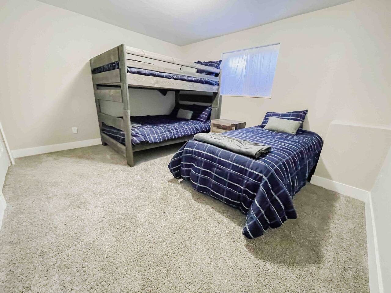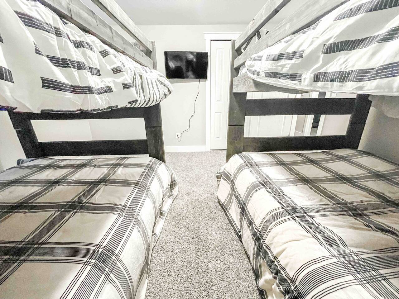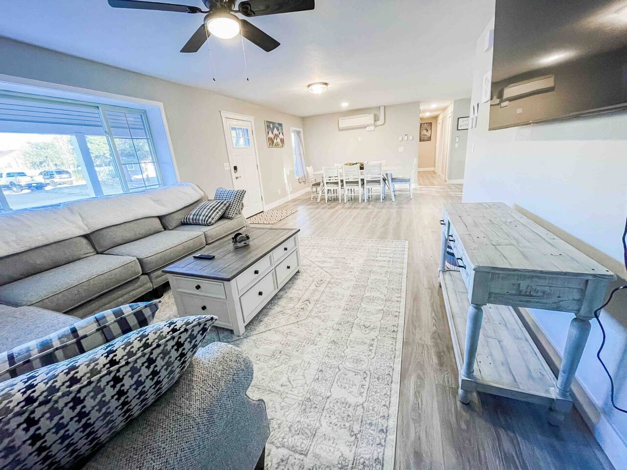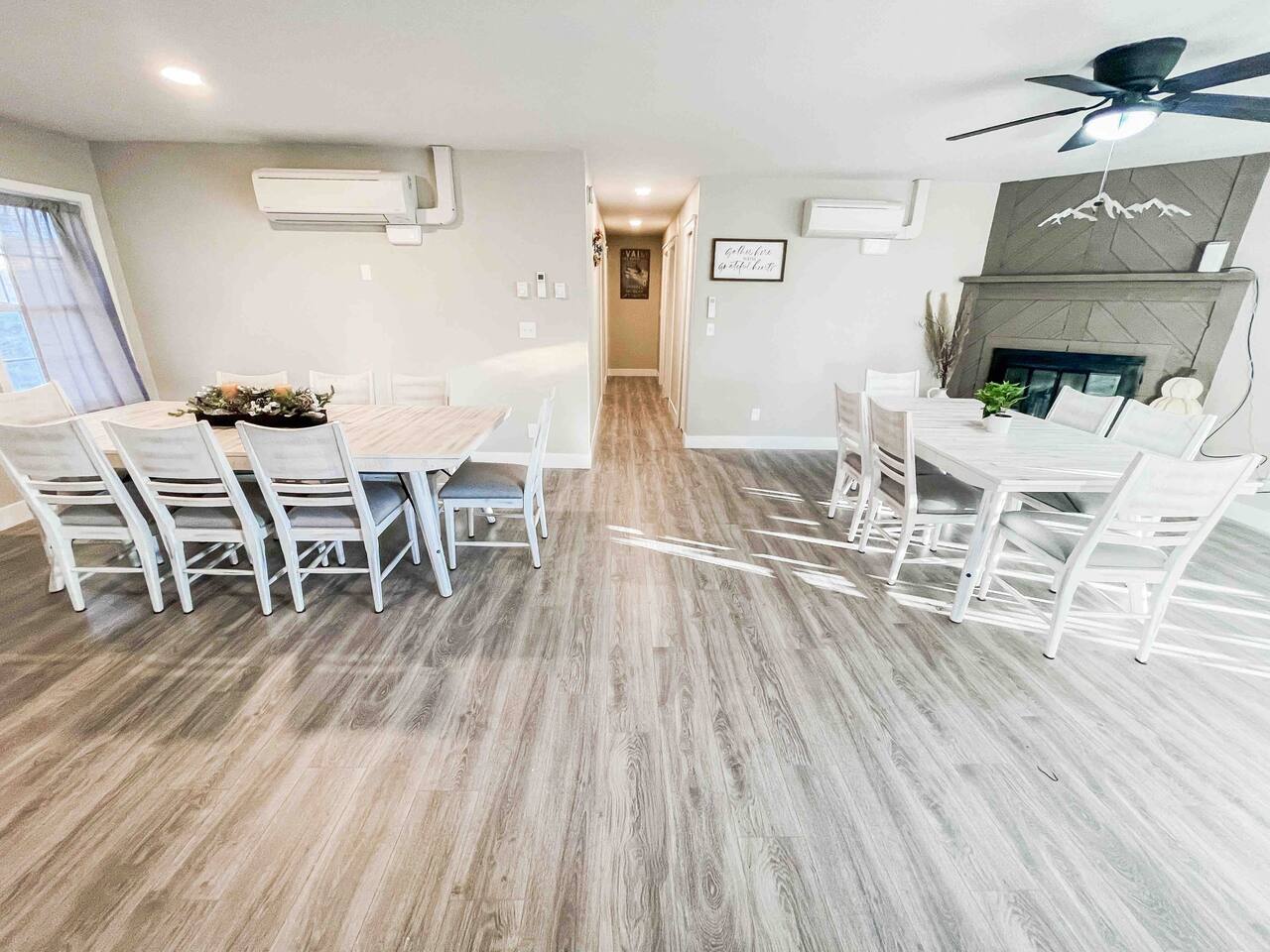 Welcome to home to this beautifully renovated 6 bedroom, 4 bath house located in North Colorado Springs. Walking through the front door you will be greeted by an open concept living, dining and kitchen. Relax on the large sectional sofa in front of one of two 70 in tvs or head straight out back to the spacious backyard; complete with a fire pit to enjoy on those chilly Colorado evenings. This home is perfect for large groups! Eat at one of two farmhouse style dining room tables, the eat in kitchen island, or one of the two outdoor picnic tables located under the backyard awning, complete with outdoor string lights to create the ambiance you're looking for on your vacation. Spread out in one of the two huge living rooms or game room! The kids can play downstairs with one of the many games provided, including shuffle board, ping pong, or a mix of various board games. Play a game of horse shoes outside while you take in the gorgeous Colorado sky. In case the two 70 in. TV's aren't enough, every bedroom has it's own tv! Several sleeping arrangements means everyone can rest comfortably. There are two master bedrooms with en suite bathrooms! A bunk room for the kids includes four full size beds! A second bunk room has a full over full bunk with a twin bed. There are two additional king size bedrooms complete with their own tvs. This home has it all for the group who wants entertainment, space, and a gorgeous farmhouse style interior to make lasting memories in.