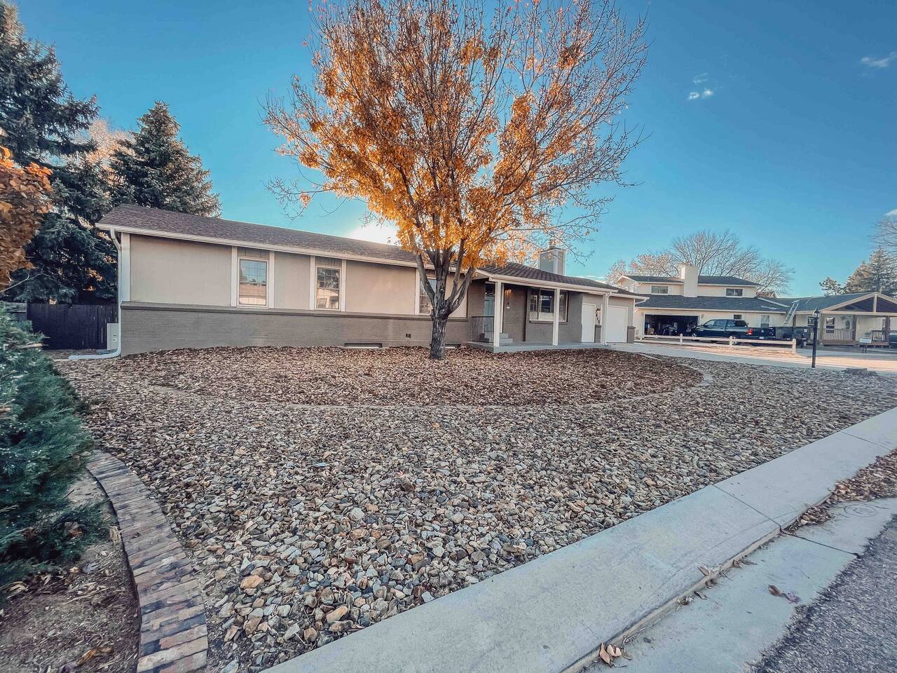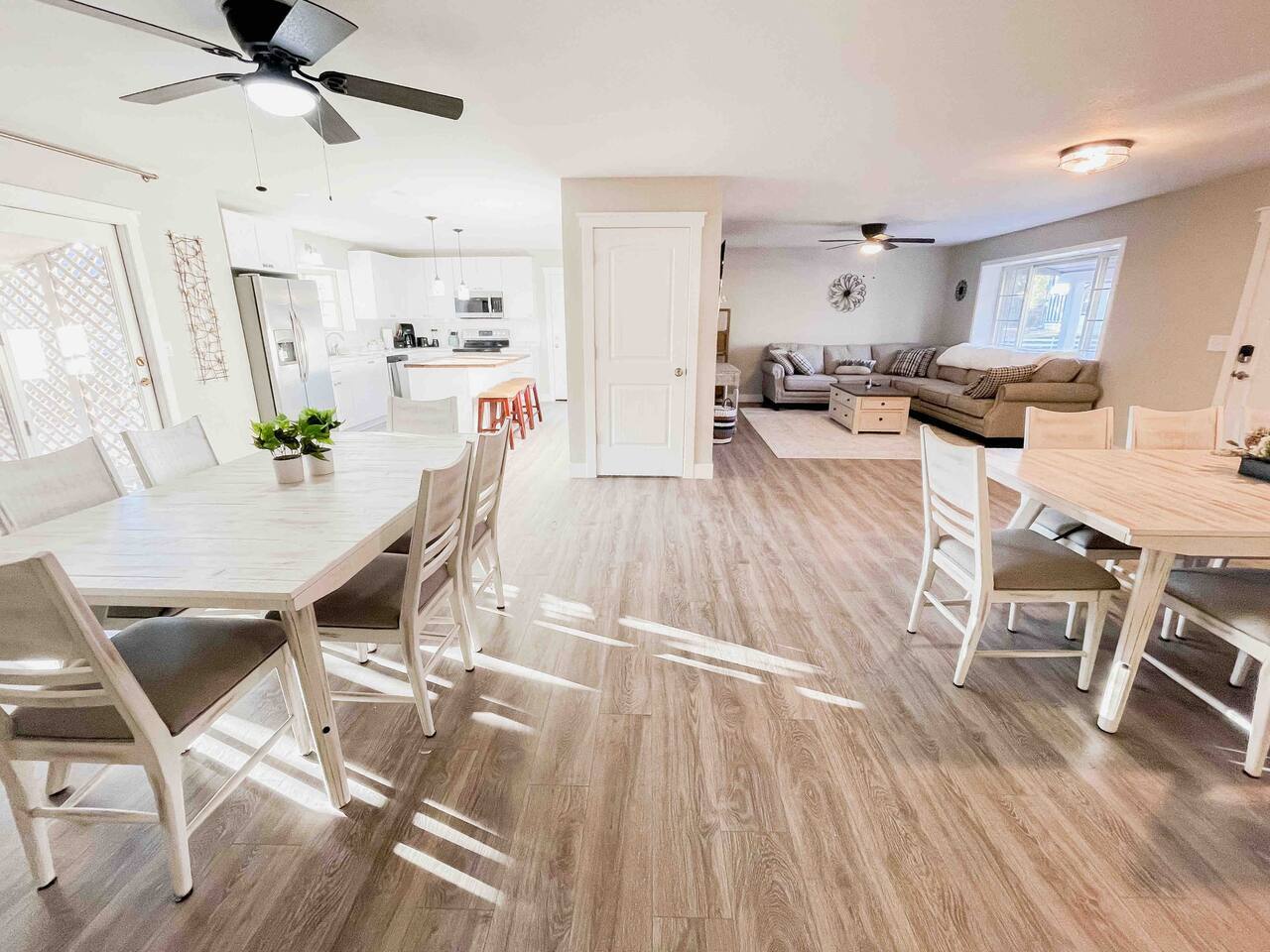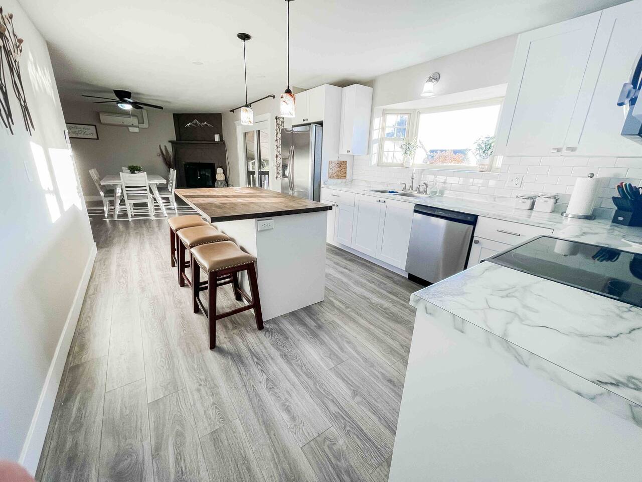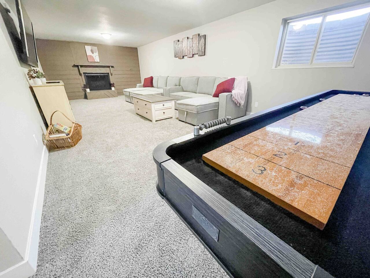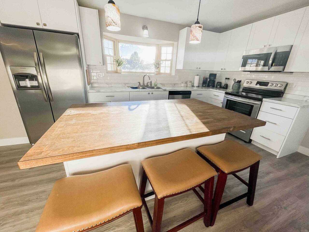 Welcome to home to this beautifully renovated 6 bedroom, 4 bath house located in North Colorado Springs. Walking through the front door you will be greeted by an open concept living, dining and kitchen. Relax on the large sectional sofa in front of one of two 70 in tvs or head straight out back to the spacious backyard; complete with a fire pit to enjoy on those chilly Colorado evenings. This home is perfect for large groups! Eat at one of two farmhouse style dining room tables, the eat in kitchen island, or one of the two outdoor picnic tables located under the backyard awning, complete with outdoor string lights to create the ambiance you're looking for on your vacation. Spread out in one of the two huge living rooms or game room! The kids can play downstairs with one of the many games provided, including shuffle board, ping pong, or a mix of various board games. Play a game of horse shoes outside while you take in the gorgeous Colorado sky. In case the two 70 in. TV's aren't enough, every bedroom has it's own tv! Several sleeping arrangements means everyone can rest comfortably. There are two master bedrooms with en suite bathrooms! A bunk room for the kids includes four full size beds! A second bunk room has a full over full bunk with a twin bed. There are two additional king size bedrooms complete with their own tvs. This home has it all for the group who wants entertainment, space, and a gorgeous farmhouse style interior to make lasting memories in.